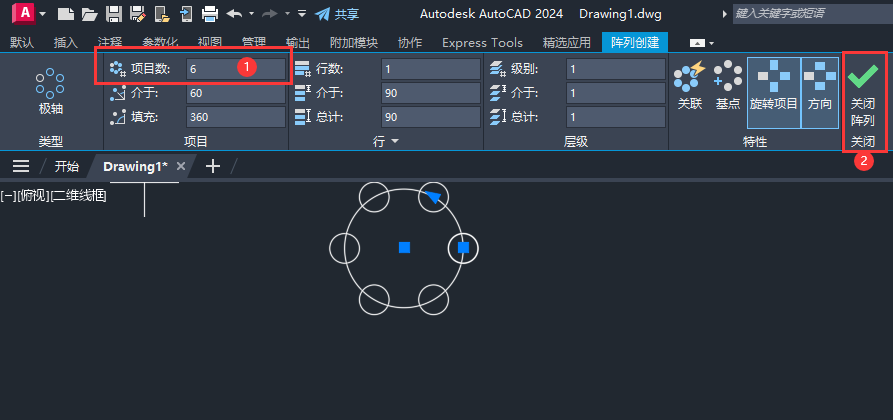 4、然后输入项目数:6,点击关闭阵列。如下图: