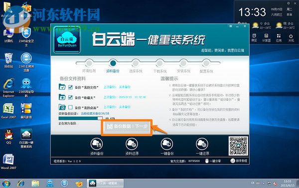 3、进入数据备份界面,用户点击“资料备份”或者“一键备份”按钮,根据自己的需要备份您的重要资料/文件,完成备份后,我们点击备份数据,下一步(当用户重装系统后,运行本软件,然后点击资料还原或者一键还原即可)。