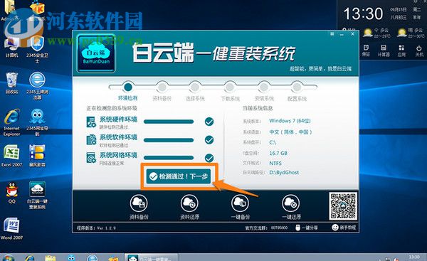 2、随后,软件会自动检测您的电脑环境,检测完毕后,我们点击“检测通过!下一步”。
